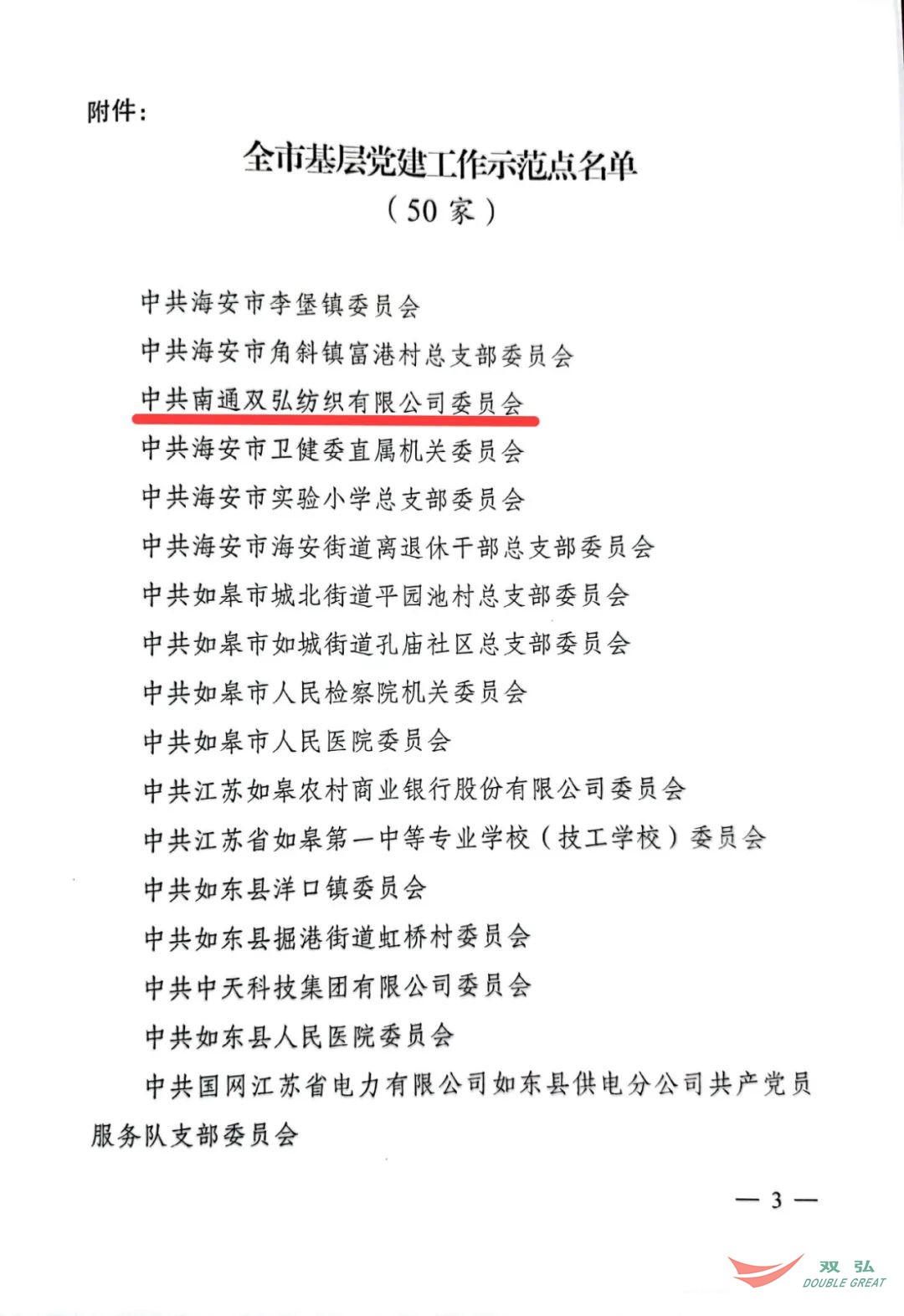 日前,中共南通市委组织部发文命名50个基层党组织为全市基层党建工作示范点。南通双弘纺织有限公司党委被授予“全市基层党建工作示范点”称号。